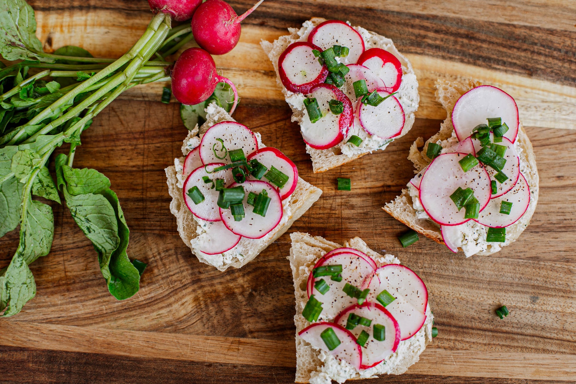 A comforting, farm-style brunch spread starts featuring a bright, crisp radish crostini for a fresh, savory bite, golden, savory quiche baked to perfection, alongside rich baked French toast with a soft custardy center. The table is rounded out with crispy bacon, and a colorful assortment of fresh seasonal fruit. Served with two refreshing drinks and finished with a delicate homemade pavlova topped with cream and fruit.